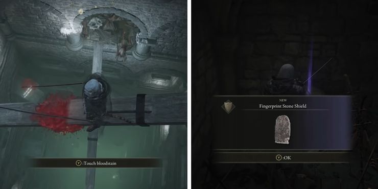 Para obtener el Escudo de piedra de huellas dactilares, los aventureros empañados deben llegar a la Catedral de los Renegados, la arena del jefe donde deben derrotar a Mohg el Presagio para progresar. Luego, los jugadores deben golpear el altar iluminado por velas detrás del cofre del jefe para disipar un Muro ilusorio en Anillo de Eldenrevelando un pasadizo oculto al mar de agujas de cadáveres de comerciantes.