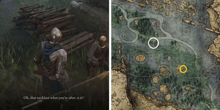 Después de llegar a las ruinas, continúe hacia el noroeste hasta llegar al Telescopio Birdseye, ingrese a la glorieta de piedra que se encuentra a su derecha. En el interior, Tarnished se encontrará con un Anillo de Elden NPC con el nombre de Rya. Ella le pedirá al jugador que recupere su collar, que le fue robado a un matón. Naturalmente, ella no puede informar al protagonista del paradero del ladrón, pero afortunadamente, el ladrón se puede encontrar razonablemente cerca.