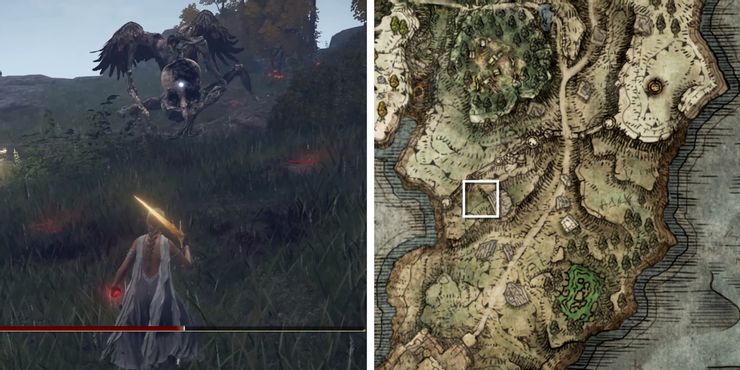 Para encontrar este Deathbird, viaja hacia el sur desde el Puente del Sacrificio hasta el Sitio de Gracia del Castillo Morne Rampart. Después de atravesar la pared derrumbada hacia el Fragmento de mapa, gira a la derecha y sube por la pendiente rocosa para llegar a un trozo gigante de escombros que se encuentra cerca de las paredes exteriores. Abajo, en el parche de hierba de abajo, es donde aparecerá el jefe de campo. Tenga en cuenta que los Deathbirds solo emergen después del anochecer, lo que significa que no aparecerá nada si Tarnished visita esta área durante el día.