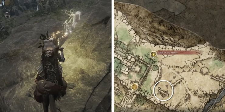 A medida que los viajeros empañados exploran el área trasera de la mansión, emergerá un camino cerca de un Grave Glovewort [1]. Después de llegar a una gran roca puntiaguda con bolos de deshielo, gira a la derecha y dirígete hacia el suroeste hasta un pequeño cementerio. Varios albinaúricos hostiles patrullarán la zona. En consecuencia, elimínelos antes de seguir explorando. Detrás de otra roca que sobresale, los aventureros verán un fantasma sentado contemplando el paisaje representado en la Pintura de la Resurrección en Anillo de Elden. Acércate al espíritu para que se desvanezca, dejando atrás las dos piezas del Juvenile Scholar Set.
