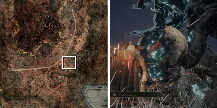 Aquellos que aún no han explorado esta sección de Caelid pueden teletransportarse al norte del Pantano de Aeonia usando el cofre de trampa de teletransportación dentro de las ruinas quemadas por el dragón de Limgrave. Después de salir del túnel de cristal de Sellia, cabalga directamente hacia el sur a través de la laguna podrida para llegar al banco del pantano de Aeonia del sur. El objetivo Pájaro del rito de la muerte se puede encontrar un poco fuera de la carretera hacia el este, cerca de una Arteria Leaf.