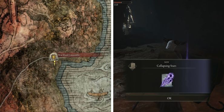 La ubicación de la Hechicería de las Estrellas Colapsadas son las profundidades podridas de las Catacumbas de los Muertos en la Guerra en Anillo de Elden. La entrada a esta mazmorra se puede encontrar en el extremo noreste del enorme campo de batalla en el este de Caelid. Tenga en cuenta que esta área no estará disponible para la exploración hasta que Tarnished haya derrotado a Starscourge Radahn y haya obtenido acceso a Nokron Eternal City. Sin embargo, una vez que ha sido vencido, los aventureros pueden viajar rápidamente al Starscourge Radahn Site of Grace y dirigirse hacia el norte hacia los acantilados para encontrar las War-Dead Catacombs.