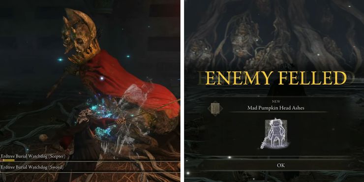 Una vez que Tarnished llega al final de las catacumbas menores de Erdtree, deben enfrentarse al Erdtree Burial Watchdog Duo. Uno lanzará hechizos mágicos al jugador, mientras que el otro atacará continuamente con su espada. Se recomienda que los aventureros eliminen a uno primero, preferiblemente al atacante cuerpo a cuerpo, y luego se ocupen del otro. Una vez que el Watchdog Duo haya sido derrotado, Anillo de Elden Empañado será recompensado con las Cenizas de Cabeza de Calabaza Loca.