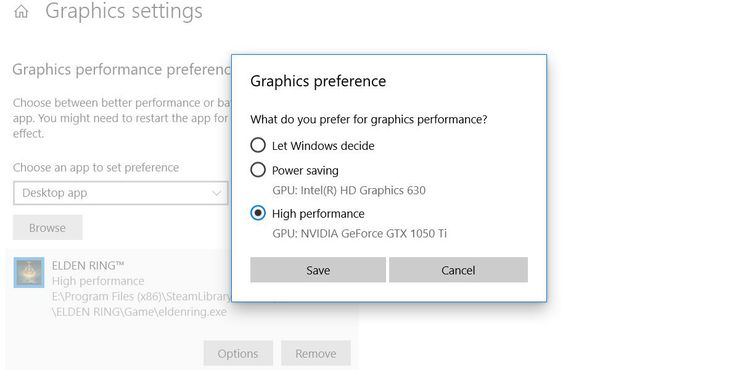 El primero es obligar a Windows a ejecutar el juego en Modo de alto rendimiento. Esto se puede hacer usando el Configuración de gráficos aplicación que se puede buscar directamente en Windows. Si Anillo de Elden no se encuentra automáticamente, los usuarios pueden usar la función de búsqueda para encontrar el eldenring.exe directamente en su carpeta de instalación, como SteamLibraryteamapps\common si se compra en Steam. Además, si uno está usando Steam, también querrá Verificar la integridad de los archivos del juego haciendo clic derecho en Anillo de Elden en la biblioteca y seleccionando el indicador de administración.