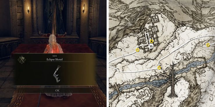 La ubicación del Eclipse Shotel es la Iglesia del Eclipse, una pequeña capilla dentro de los muros del Castillo Sol. Esta fortaleza se encuentra cerca de un mausoleo ambulante en el punto más septentrional de la mitad oriental de las Cima de las Montañas de los Gigantes. Para llegar a esta región y a la ubicación del arma legendaria, los viajeros empañados deben derrotar a la sombra dorada de Godfrey y al rey Morgott en Leyndell para recibir el medallón Rold de Melina. Este medallón permitirá al jugador acceder a las Montañas de los Gigantes en el Gran Ascensor de Rold.