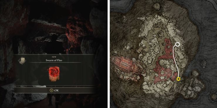 Aquellos que usen la Puerta de Envío llegarán a un túnel de cueva cerca del Sitio de Gracia de Palace Approach Ledge-Road. A continuación, para encontrar el encantamiento Enjambre de moscas, los aventureros deben dirigirse por el sendero hacia el norte y adentrarse en la laguna roja como la sangre en Anillo de Elden. Ten cuidado con el grupo de albinaúricos que custodian este camino. Entra en la segunda caverna a la derecha y llega al final para obtener el hechizo de un cadáver.