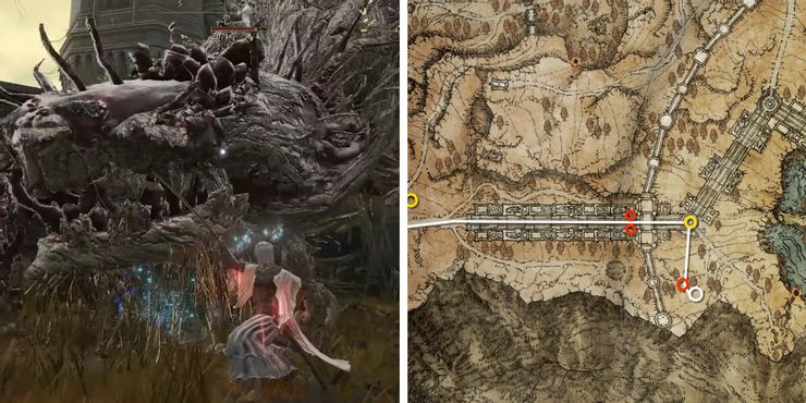 Mientras que obtener el Giant-Crusher es sencillo, el área alrededor de la ubicación del martillo es algo peligrosa. Cuando los aventureros se acerquen al vagón, un espíritu de árbol ulcerado aparecerá del cielo e inmediatamente atacará al jugador. Esta variante sin jefe es idéntica a las criaturas que Tarnished habrá encontrado en Fringefolk Hero’s Grave y en la alcantarilla subterránea bajo Stormveil Castle. Sin embargo, este será notablemente más fuerte y causará un mayor daño. Se recomienda a los jugadores que aprovechen sus debilidades mediante el uso de Hechizos y ataques relacionados con Frostbite o Fire. Es relativamente fácil esquivar sus movimientos a corta distancia, pero los arqueros y los lanzadores de hechizos pueden encontrar la pelea intimidante ya que la bestia puede cubrir terreno rápidamente.