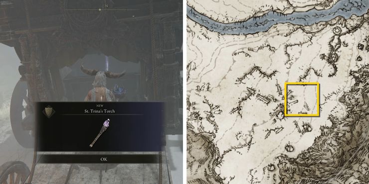 La Antorcha de Santa Trina se puede obtener de una caravana ambulante en Anillo de Elden, ubicado en el Campo de Nieve Consagrado. Tarnished puede llegar a esta área una vez que hayan derrotado a Morgott de Leyndell y recolectado las dos mitades del medallón secreto de Haligtree. La mitad se puede encontrar en el Castillo Sol de las Montañas de los Gigantes, y la otra mitad está en la Aldea de los Albinaúricos de Liurnia. Una vez que ambas piezas se han reunido, los aventureros pueden ingresar al Camino Oculto al Haligtree, que conduce al Campo de Nieve Consagrado.