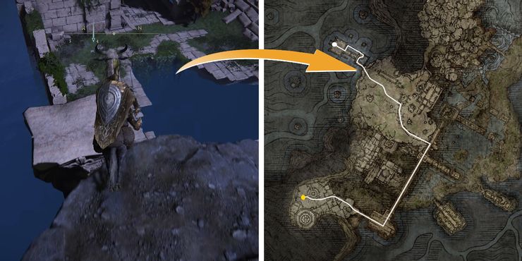 Viaja al claro del noroeste de los bosques ancestrales de Nokron en Anillo de Elden ver una ruina sumergida a lo lejos. Usa la cornisa más cercana para saltar a las ruinas desde lo alto de Torrent. Después de llegar al otro lado, desmonta y trepa con cuidado por la pared rota de la derecha. Corre por la pasarela hasta el final, pero ten en cuenta la brecha en el camino. Monte Torrente de nuevo para saltar al brasero vacío. Un Chamán Seguidor Ancestral estará custodiando el cofre con la Cabeza del Infante Ancestral. Antes de ingresar a la estructura, Tarnished puede derribar fácilmente a este enemigo con ataques a distancia. Luego, abra el cofre para recibir la herramienta única de vapeo espiritual en Anillo de Elden.
