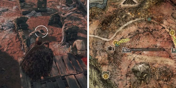 Para llegar a las Ruinas Abandonadas, los viajeros deben seguir el camino hacia el noreste desde Limgrave hasta la Iglesia Ardiente en Caelid. En el camino, se encontrarán con una bifurcación en el camino. La izquierda lo llevará a uno de los Erdtree de la región, y la derecha continuará por la carretera. Viaje más abajo por el camino de la autopista y luego descanse en el Balcón del Sitio de Gracia de Rotview. Cabalgando sobre Torrent, corre hacia la estatua de Imp Seal y disipa la barrera. Durante este tiempo, el monstruo cuervo se estrellará contra el jugador pero no podrá dañarlo. Inmediatamente esquiva y rueda, descendiendo a la cripta de abajo. Abre el cofre para adquirir la Espada de Santa Trina.