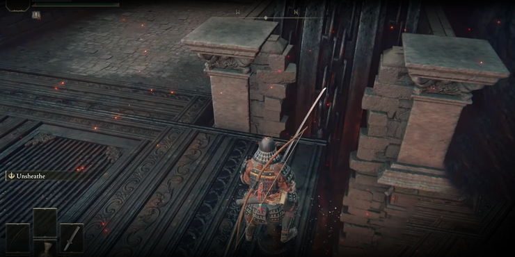Luego, salta desde el techo y dirígete hacia el este para regresar a la rampa, solo que esta vez después de las escaleras, dirígete hacia una pequeña jaula colgante. Después de llegar a la cima, gira a la izquierda mientras evitas con cuidado al peligroso enemigo que permanece allí, y luego vuelve a girar a la izquierda para activar la palanca y levantar el puente. En el otro lado, colgando de una repisa, hay un cuerpo que contiene la Piedra de herrería sombría 7. Sin embargo, llegar a él requerirá un salto complicado en Anillo de Elden. Primero, los jugadores deben saltar sobre una pequeña perilla que sobresale del puente y usarla para saltar sobre el pasamanos de piedra adyacente a las dos ruedas de metal encadenadas. Después de eso, súbete a la rueda más grande e intenta saltar a la cornisa con la antorcha que está al lado del cuerpo. Esto puede requerir algunos intentos, pero si tiene éxito, los jugadores deberían poder caminar a lo largo de la repisa para saquear el objeto y luego asegurarse de morir para teletransportarse de regreso a donde aparecieron por primera vez en esta área.