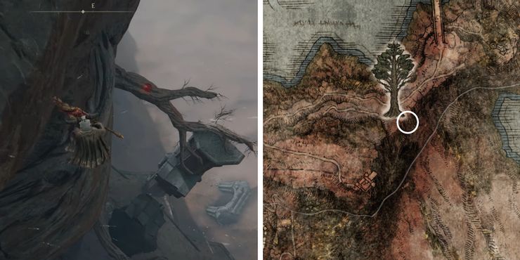 Un Putrid Avatar estará protegiendo la base del Minor Erdtree y se volverá hostil si Tarnished se acerca demasiado. Por lo tanto, se recomienda a los aventureros derribar a la bestia antes de seguir explorando o pasar a hurtadillas agachándose o usando el Hechizo de forma invisible. Desde el lado sur del árbol, camina hacia la olla grande que se encuentra cerca de la repisa en forma de V. Los viajeros notarán una raíz gruesa que sobresale del acantilado de abajo. Posicionándose con cuidado desde la cresta suroeste, descienda a la plataforma de abajo. Es probable que el jugador sufra daños, pero la caída no debería matar a Tarnished, especialmente a aquellos con un nivel de personaje alto.