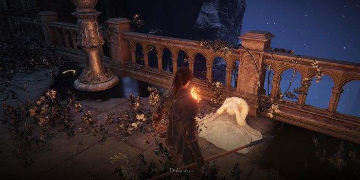 Anillo de Elden tiene lugar en Lands Between, que ha sido desgarrado por The Shattering. Los jugadores controlan a un personaje deslustrado que se levanta de entre los muertos para convertirse en Elden Lord y restaurar el orden en el reino. Sin embargo, no son el único personaje deslustrado dentro del mundo abierto. Los jugadores pueden conocer a otros NPC y descansar con otros Tarnished en Roundtable Hold. Aquellos que buscan el título de Elden Lord descansan en el santuario, donde está prohibida la violencia. Desafortunadamente, eso no impide que Fia mate a D y huya de la escena poco después.