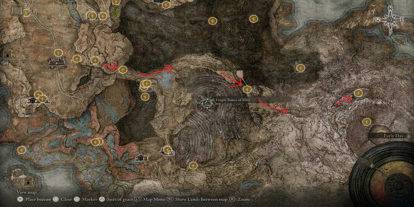 Encontrar al dragón antiguo Senessax es bastante sencillo. Solo tienes que seguir el camino del Sitio de Gracia que se muestra en la imagen de arriba. Sitio de gracia de Dragon’s Pit,dirígete al este hasta la terminal del Pozo del Dragón, luego sigue hacia el este, dobla la curva y pasa el puente angosto hasta el Pie del sitio de gracia de Jagged Peak.