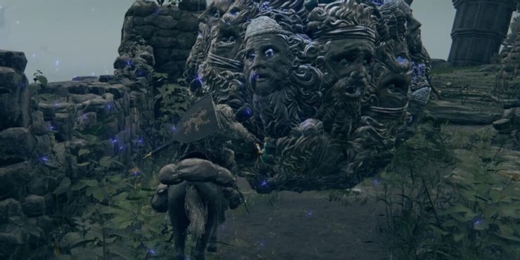 Era una pesadilla: docenas, si no cientos, de caras de piedra que gritaban se fusionaron en una bola, un guardián de las Ruinas Witchbane que arrojaba rayos de energía mágica al cielo como un volcán en erupción. Los proyectiles Glintstone de Ascalon se desprendieron como la lluvia sobre un hule; drenados de su enfoque, el joven astrólogo se vio obligado a cortarlo en pedazos con su desgastado bracamarte, entrando y saliendo a caballo antes de que pudiera descargar más calamidades mágicas.