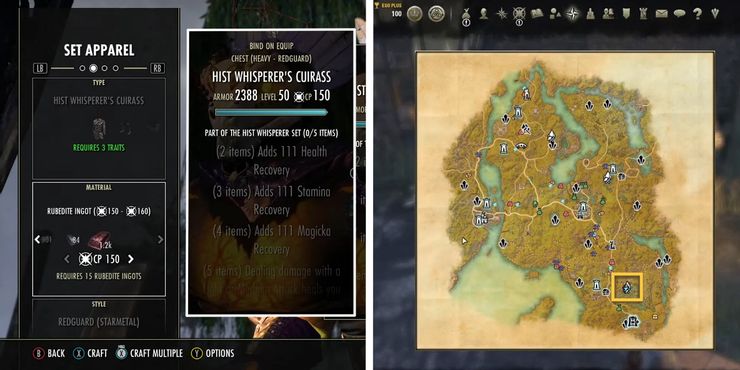 La forma principal de obtener Hist Whisperer Set en The Elder Scrolls Online es a través de la elaboración, lo que significa que hay requisitos particulares que deben cumplirse antes de que se pueda hacer el conjunto. Primero, los jugadores deben viajar a la estación de elaboración única de Hist Whisperer en Blackwood, cerca de la frontera entre Cyrodiil y Black Marsh. El banco de trabajo está ubicado al sureste de Blackwood en Withered Root, que se puede encontrar al este de Stonewastes y al norte de Rockgrove Trial.
