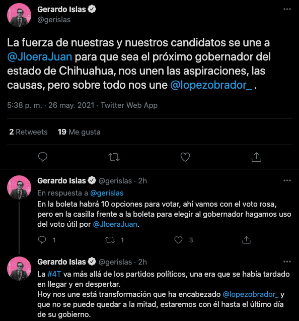 “Nos une Andrés Manuel López Obrador, le duela a quien le duela, la Cuarta Transformación va más allá de los partidos políticos, es una era que se había tardado en llegar y en despertar como lo fue el sentimiento de la Independencia de México, hoy nos une esta transformación que ha encabezado el presidente López Obrador y estaremos con él hasta el último día de su gobierno”, afirmó Gerardo Islas durante el anuncio.