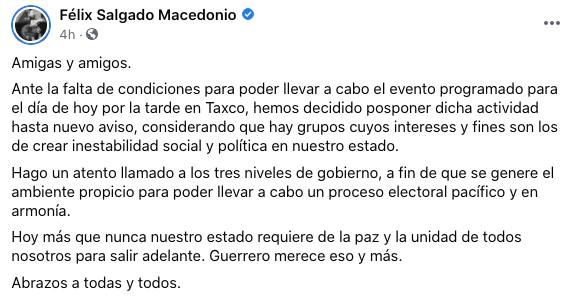 “Ante la falta de condiciones para poder llevar a cabo el evento programado para el día de hoy por la tarde en Taxco, hemos decidido posponer dicha actividad hasta nuevo aviso, considerando que hay grupos cuyos intereses y fines son los de crear inestabilidad social y política en nuestro estado“, señaló a través de una publicación en su perfil de Facebook.