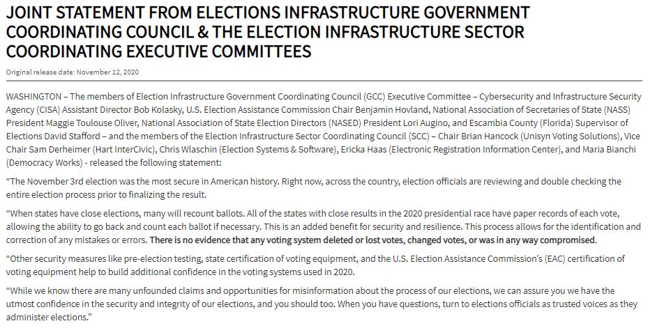 “En todo el país, los funcionarios electorales están revisando y constatando todo el proceso electoral antes de concluir el resultado”, señalaron en el comunicado firmado por los presidentes de la Asociación Nacional de Directores Electorales Estatales y de la Asociación Nacional de Secretarios de Estado, que dirigen los comicios a nivel estatal; así como a la Comisión Ejecutiva del Consejo Coordinador de la Industria y el Gobierno, que incluye a todos los principales proveedores de equipos de votación.