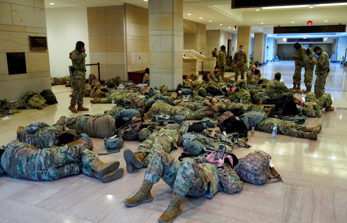 A través de redes sociales se compartieron fotos y videos en donde se observa a las tropas descansando en el piso durante la madrugada con sus armas al lados, bajo los bustos de Lincoln y Washington.
