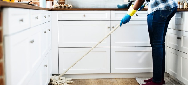 Lave a fondo el piso de su cocina con un limpiador de pisos. La mayoría tienen un aroma distintivo a limón y destruirán cualquier agente que cause olor en el piso de la cocina.