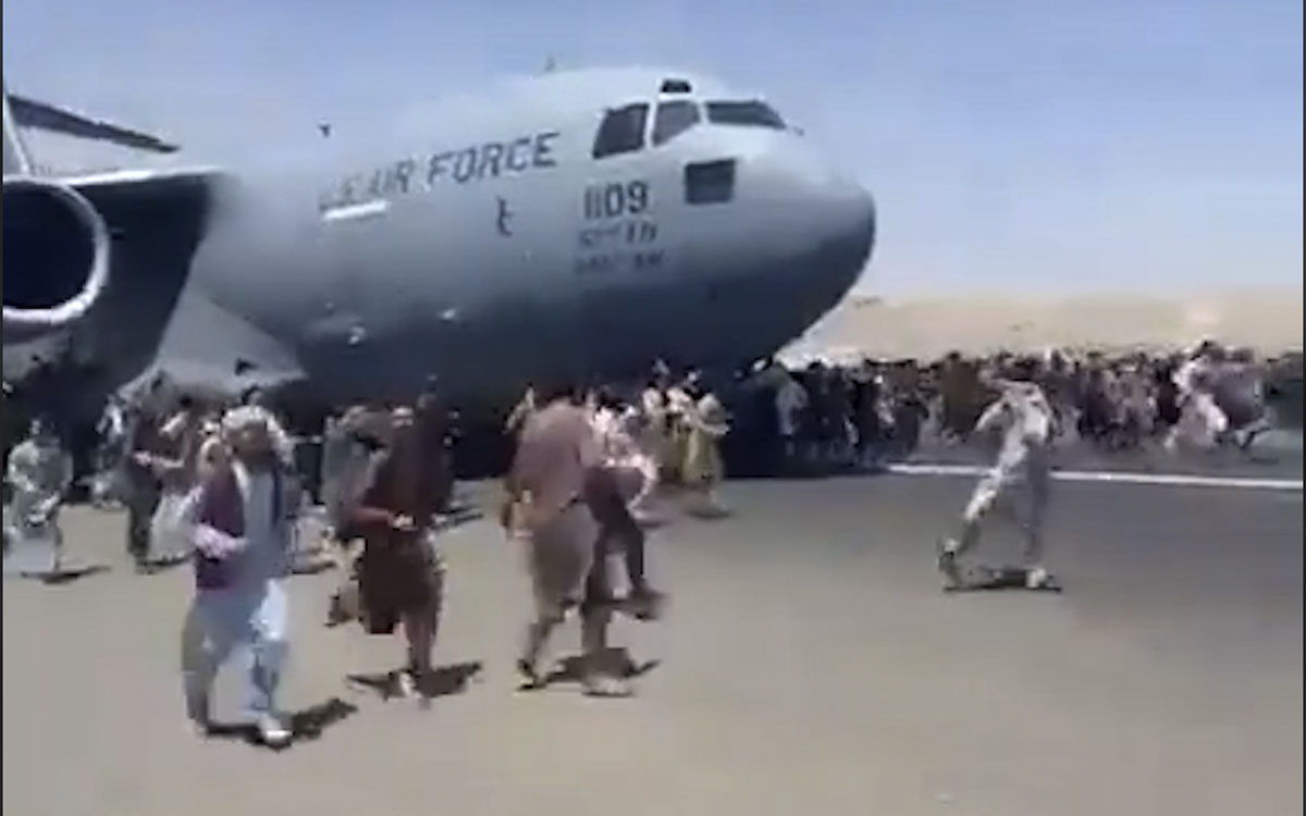 Las multitudes convergieron en el aeropuerto en busca de escapar, incluidos algunos que se aferraron a un avión de transporte militar estadounidense mientras rodaba en la única pista, y una persona pareció caer del avión durante el despegue, según imágenes de televisión.