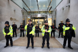 Policías londinenses hacen guardia mientras activistas medioambientales bloquean la entrada a la bolsa de valores de Londres durante la protesta del movimiento ecologista Extinction Rebellion (Foto: REUTERS / Simon Dawson)