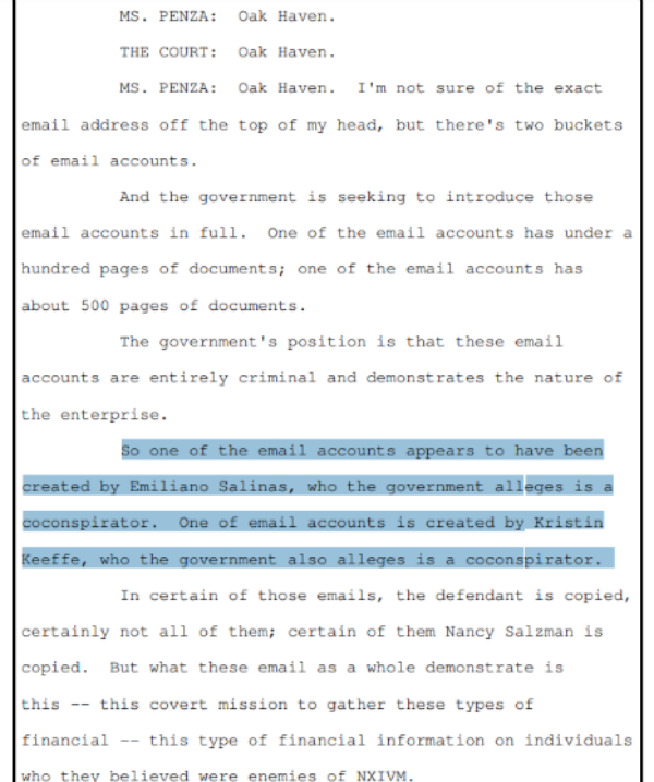De acuerdo con la transcripción de la audiencia, Penza explicó que Salinas Occelli presuntamente abrió diversas cuenta de correo electrónico utilizadas por Nxivm para acumular información sobre sus enemigos, por lo que la asistente del fiscal se refiere a que se trata de “cuentas completamente criminales”.
