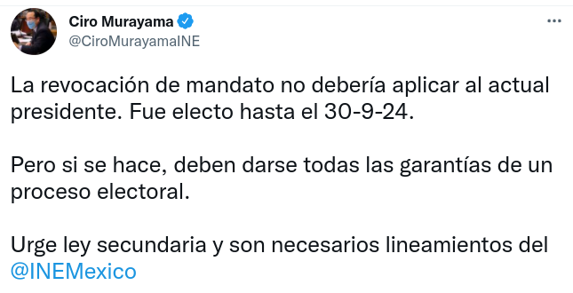 “Yo creo que la democracia representativa puede ser lesionada por la democracia plebiscitaria y que los ejercicios de democracia directa deben ser complementarios”; sin embargo, añadió que más allá de su opinión personal, la Revocación de Mandato está ya en la Constitución y el INE debe enfrentarla con toda seriedad”, manifestó Murayama.