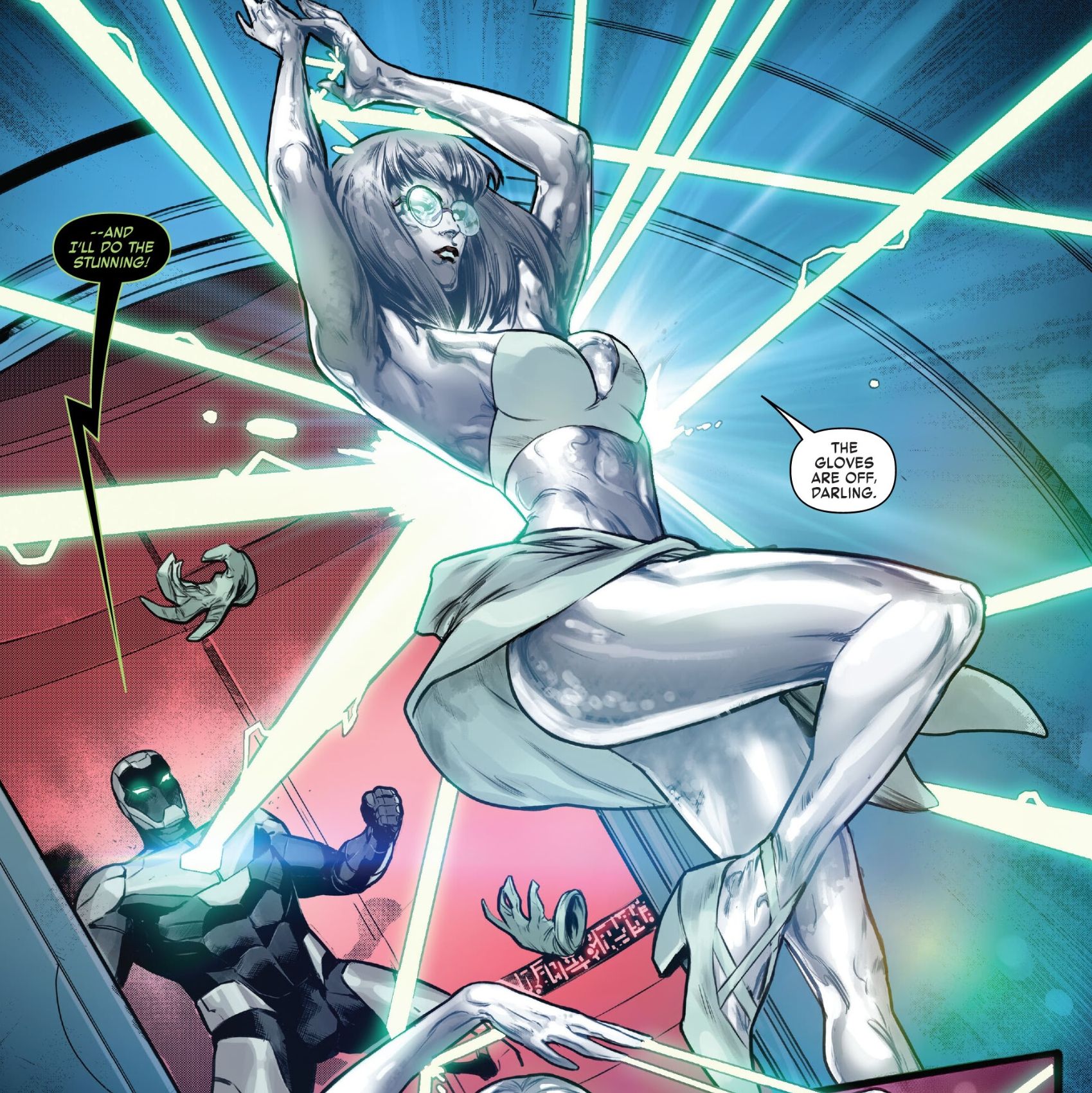 - El vínculo cada vez mayor entre Iron Man y Emma Frost está simbolizado por su poderoso ataque en equipo de “refracción explosiva”.