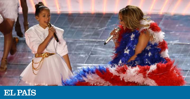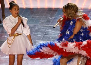 Poco después, su madre aparecía de nuevo, vestida con un mono plateado y cubierta con una enorme capa de plumas que por un lado tenía la bandera de EE UU y por otra la de Puerto Rico. Mientras Lopez le cogía el testigo con Let’s get loud, la pequeña entonaba uno de los grandes temas estadounidenses: Born in the USA. La canción de Bruce Springsteen de 1984 es como un himno oficioso del país, con un gran significado, por lo que llamó especialmente la atención que fuera interpretado en plena Super Bowl y más por una niña.
