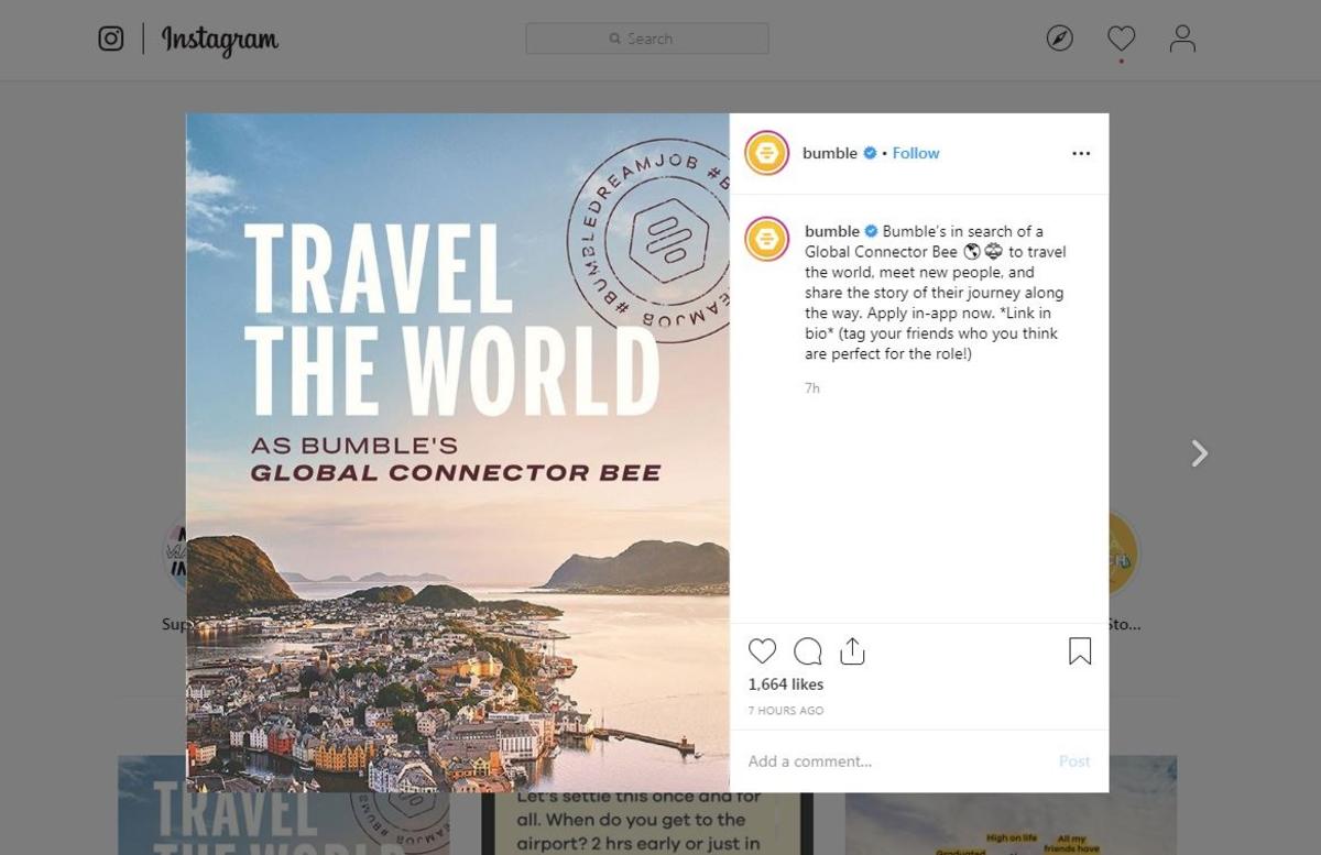 La empresa Bumble publicó en su perfil de Instagram un mensaje que dice: “Bumble está buscando un Global Connector Bee para viajar por el mundo, conocer gente nueva y compartir la historia de su viaje por el camino. Regístrate en la aplicación ahora. * Enlace en la biografía * (¡etiqueta a tus amigos que creas que son perfectos para el puesto!)”
