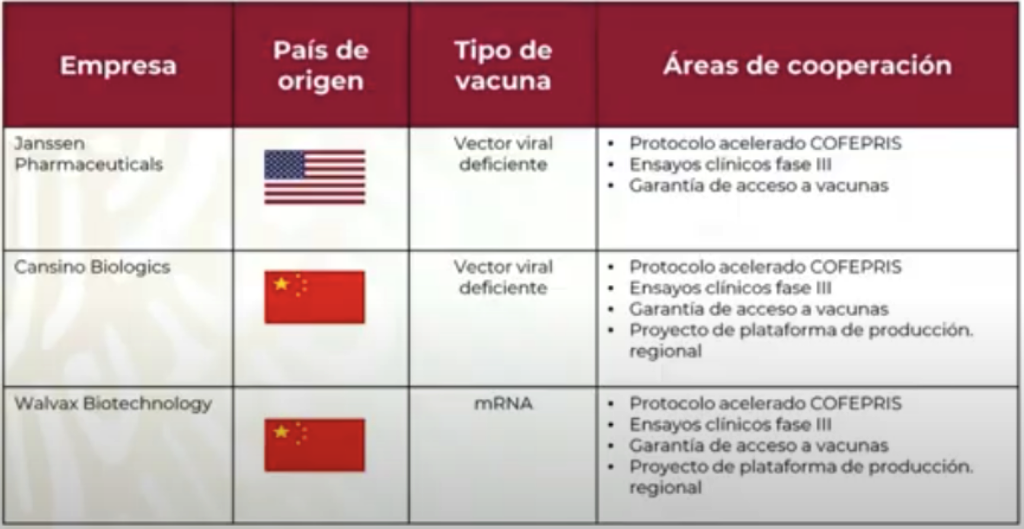 “Son muy buenas noticias, porque son tres protocolos fase 3 de proyectos muy avanzados que es lo que preocupa al presidente, que lo tengamos a tiempo. Con eso tendríamos entre septiembre y enero cuatro protocolos clínicos fase 3 en México”, expresó.