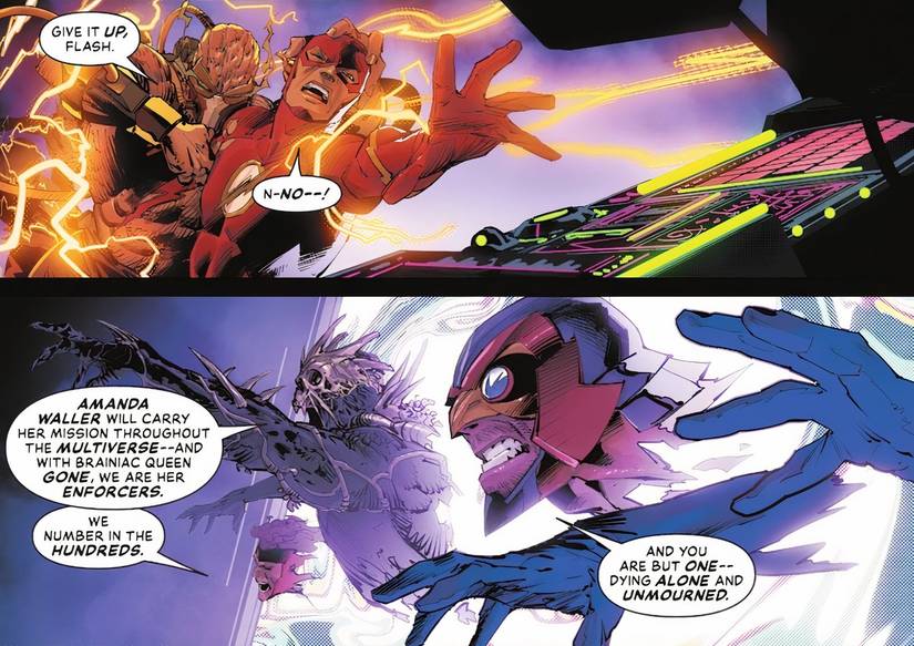 En Poder absoluto #4 de Mark Waid y Dan Mora, Barry Allen corre contra el tiempo para apagar la máquina de transmateria de Amanda Waller, que ha utilizado para forjar alianzas con villanos en todo el multiverso, consiguiendo su ayuda para derrotar a los héroes de Prime Earth.