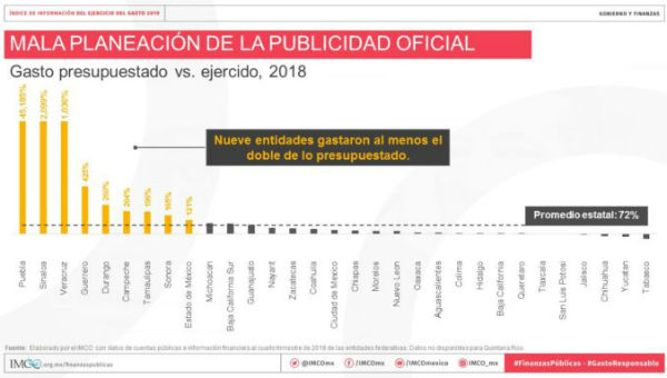 Los 32 gobiernos de la entidades del país “derrocharon” 72 por ciento más dinero presupuestado en 2018 para la difusión de mensajes y campañas para informar a la población sobre el quehacer gubernamental, señaló el Instituto Mexicano para la Competitividad (Imco).