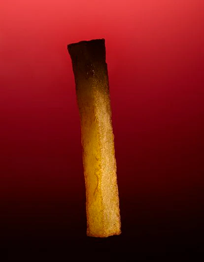 Estas últimas, las patatas fritas de cadena, son obviamente otra dimensión de la patata frita. Su faz industrial. Visitamos en Madrid un Burger King en el que nos permiten pasar a la cocina para ver cómo se fríen las suyas. Las conservan en un dispensador a -19,3 grados centígrados. De ahí caen a las cestas de metal que van a las freidoras para cocinarse a 175 grados durante 3 minutos y 10 segundos. [Las de McDonald’s, según nos informa por correo electrónico el otro gigante de la comida rápida, se hacen 3 minutos a 168 grados para resultar en “una patata con un suave color dorado y textura crujiente en su exterior”]. En Burger King nos muestran cómo a los 35 segundos de la inmersión la freidora pita para recordar que hay que sacudirlas para que no se apelmacen, cómo al terminar levantan la cesta unos segundos para que se escurra el aceite y cómo las dejan en un “patatero o estación de embolsado”, que retiene su calor por un máximo de 10 minutos hasta servirlas. Si en ese tiempo no se sirven, explican, las patatas se retiran. Así despachan en España unas 28.200 toneladas al año de patatas fritas. No son las de Juanjo López ni las de Dani Garcia, pero a cuatro adolescentes que están allí pasando la tarde les parecen “versátiles”, “sabrosas”, “algo que pega con todo en todo momento” y “básicamente lo mejor”.