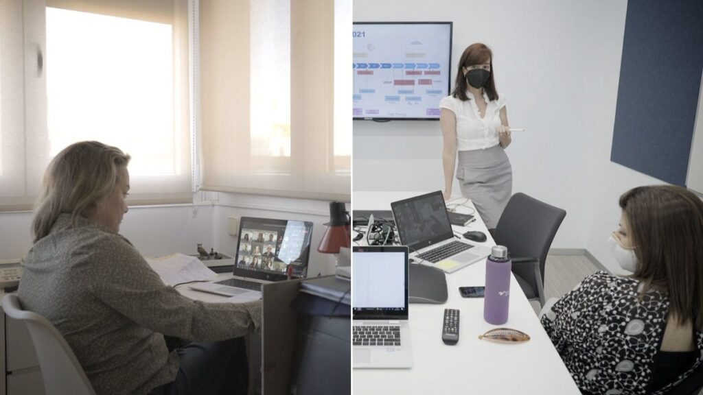 Durante la pandemia del coronavirus, el teletrabajo alcanzó las cotas más elevadas de su historia. Durante el segundo trimestre de 2020, más de tres millones de personas trabajaron desde sus hogares. Año y medio después esta realidad es muy distinta. La vuelta a la oficina se ha impuesto frente al teletrabajo, aunque 6 de cada 10 trabajadores prefiere un modelo híbrido, según el último estudio publicado por Adecco. EL PAÍS ha acompañado a dos empleadas de una empresa que ha apostado por un modelo flexible, mezclando la presencialidad y la actividad a distancia desde cualquier lugar que el trabajador elija.