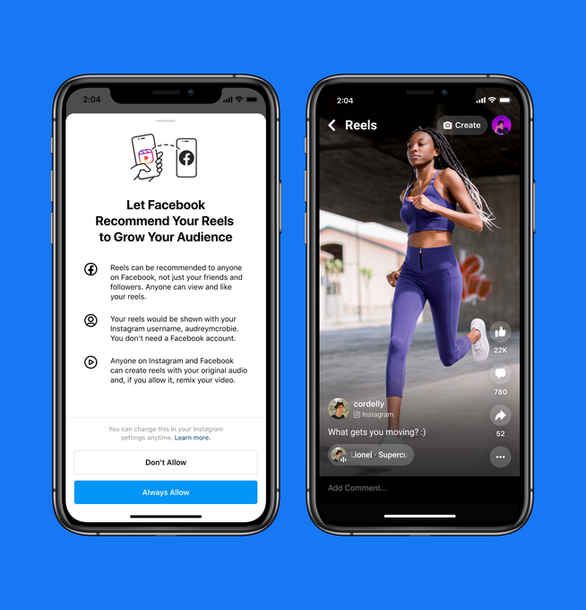 Además, Facebook dice hoy que también probará una nueva función que le dará a los creadores de Instagram en los EE. UU. La opción de que sus Instagram Reels se muestren como contenido recomendado en Facebook. Si los creadores optan por participar, sus videos aparecerán en la sección “Carretes” en la sección de noticias de los usuarios, junto con otros carretes creados en Facebook.