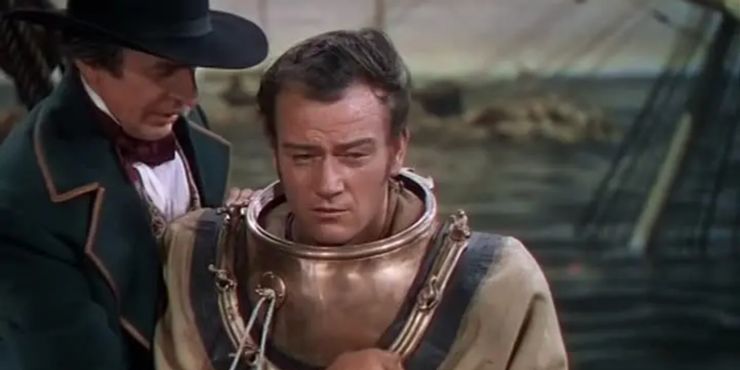 Hacia el final de la película, el personaje de John Wayne, Jack, y otro personaje principal llamado Steve, se sumergen en los restos de un barco para ver si había un polizón a bordo cuando el barco se hundió. Sin embargo, son atacados por un calamar gigante y Jack muere en la lucha contra la bestia.