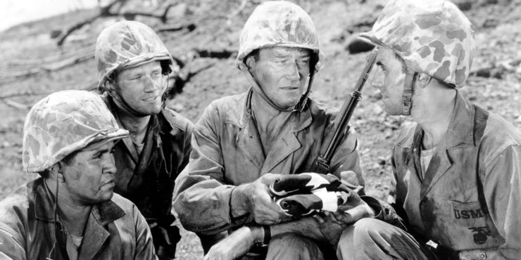 Poco después de que concluyera la Segunda Guerra Mundial, John Wayne interpretó al duro pero afectuoso sargento John Stryker en Arenas de Iwo Jima. La película de guerra sigue a una unidad desde el entrenamiento hasta su despliegue en la batalla por Iwo Jima. A lo largo de la película, su personaje pasa de ser despreciado por los soldados subordinados a ser finalmente respetado y reverenciado.