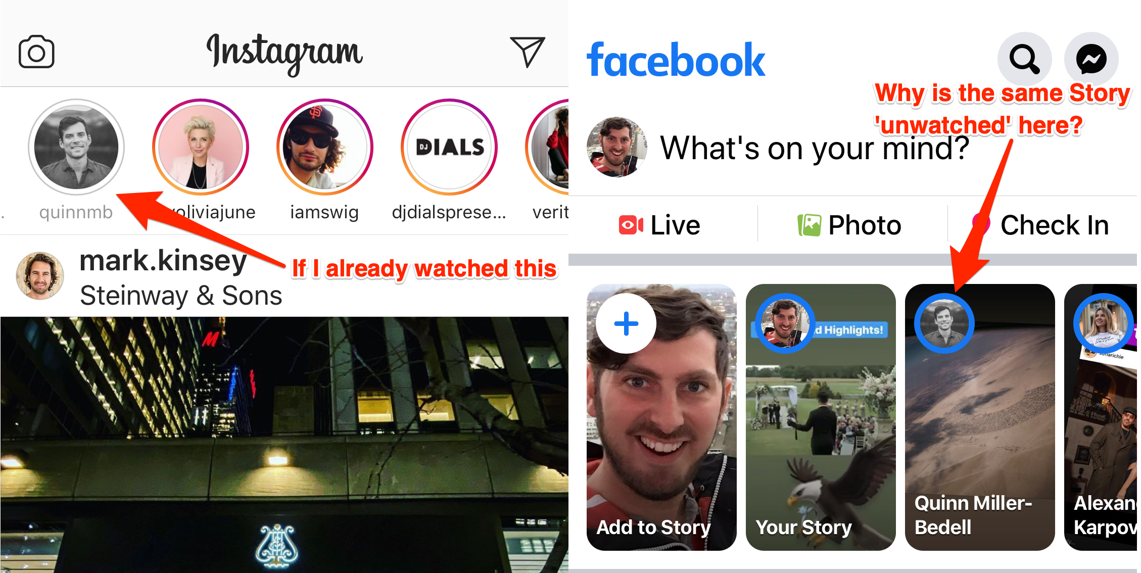 Si veo una historia publicada de manera cruzada desde Instagram para Facebook en cualquiera de las aplicaciones, debería aparecer como “visto” en la parte posterior de la fila Historias en la otra aplicación. ¿Por qué perder el tiempo mostrándome historias que ya vi?