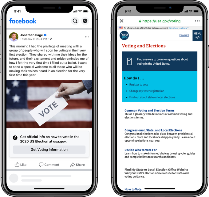 A partir de hoy, las publicaciones en Facebook de funcionarios y candidatos federales electos, incluidos los candidatos presidenciales, irán acompañadas de una etiqueta de información que incitará a cualquiera que vea la publicación a hacer clic para obtener información oficial sobre cómo votar. La etiqueta se vinculará a usa.gov/voting. Para las publicaciones que abordan específicamente el voto por correo, el enlace apuntará a una sección del mismo sitio web con instrucciones estado por estado sobre cómo registrarse para votar por correo.