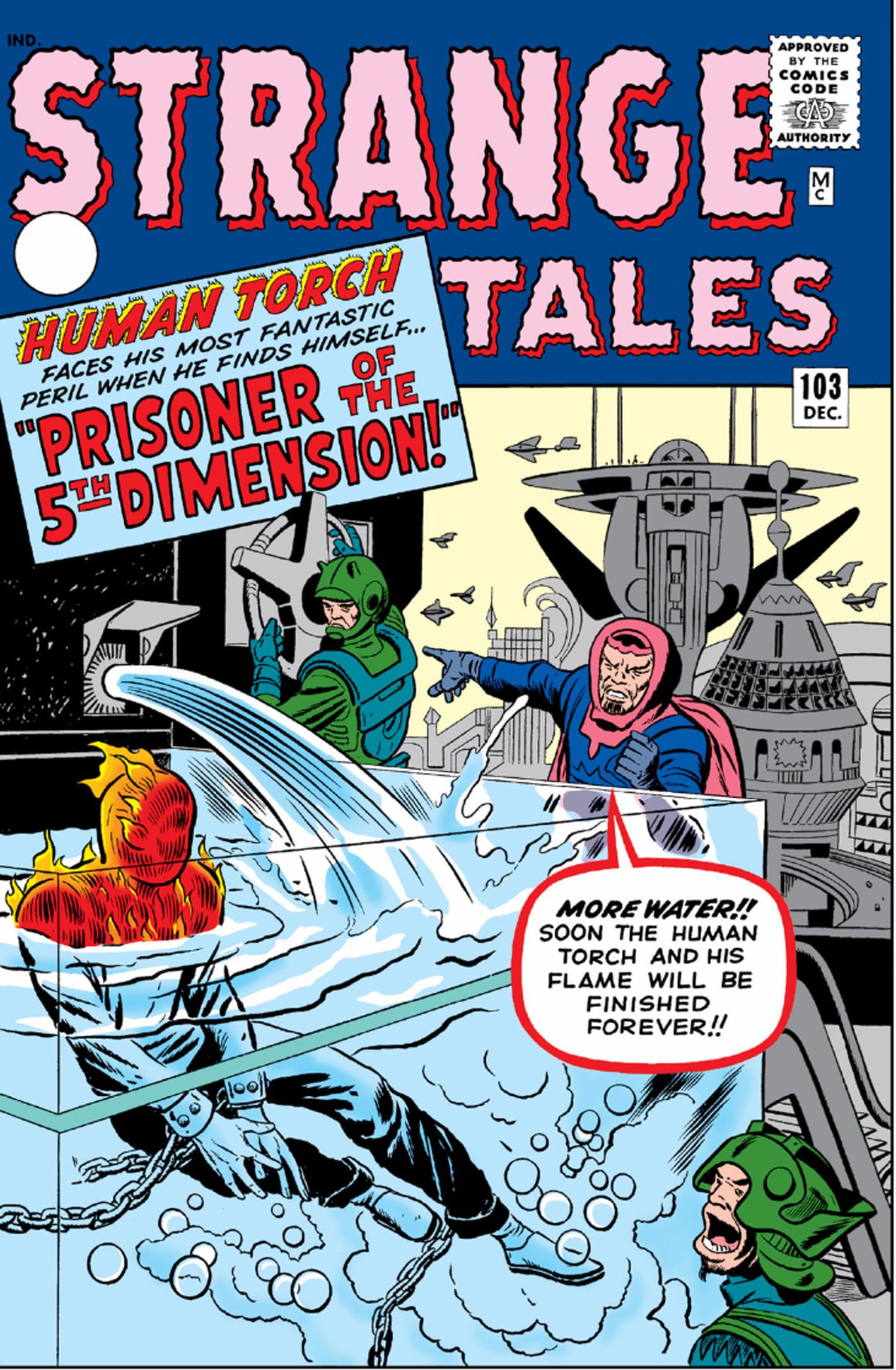 Cuentos extraños El número 103, escrito por Larry Lieber y Stan Lee, con arte de Steve Ditko y Jack Kirby, es un ejemplo perfecto de esto. Antes de la introducción oficial del Multiverso de Marvel por casi una década, “¡Prisionero de la Quinta Dimensión!” es una historia en solitario de Human Torch, en la que el héroe se enfrenta a una invasión de la Tierra por seres extraterrestres; Sin embargo, en lugar de seres del espacio, los extraterrestres provienen de una dimensión que existe junto a la suya.