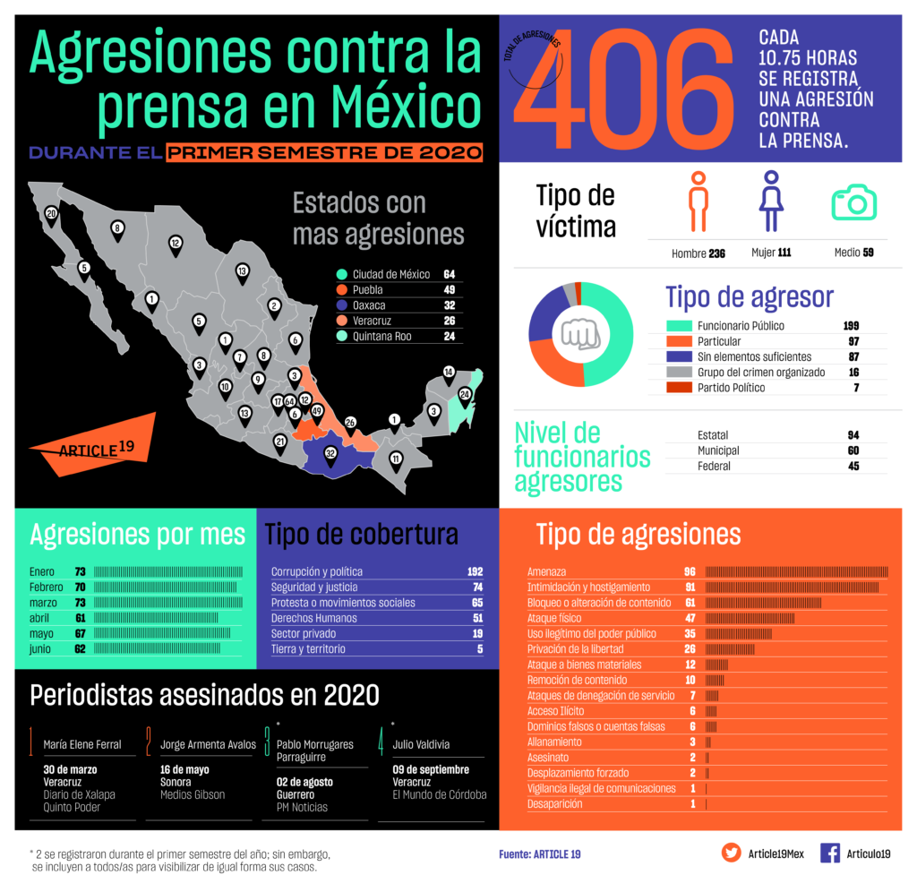 En un comunicado la organización apuntó que, con 609 agresiones, el 2019 –primer año de la administración de Andrés Manuel López Obrador– fue el año más violento contra la prensa en la última década. Sin embargo, en los primeros seis meses de este año ya se alcanzó el 66% de este infame récord. Como comparativo, este primer semestre de 2020 ya superó el total de agresiones documentadas en todo 2015. De continuar esta tendencia, el 2020 sería el año más violento para la prensa desde que ARTICLE 19 tiene registro.