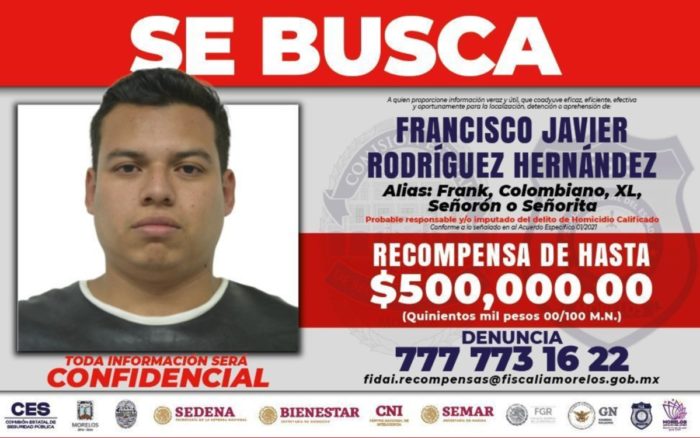 Ante la ola de violencia que se vive en Morelos, el gobierno de Cuauhtémoc Blanco Bravo anunció una recompensa de hasta 500 mil pesos a quien o quienes aporten información veraz y útil que permita la detención y aprehensión de Francisco Javier Rodríguez Hernández, ubicado por las autoridades como el “Frank”, “Colombiano”, “XL”, “Señorón” y/o “Señorita”.