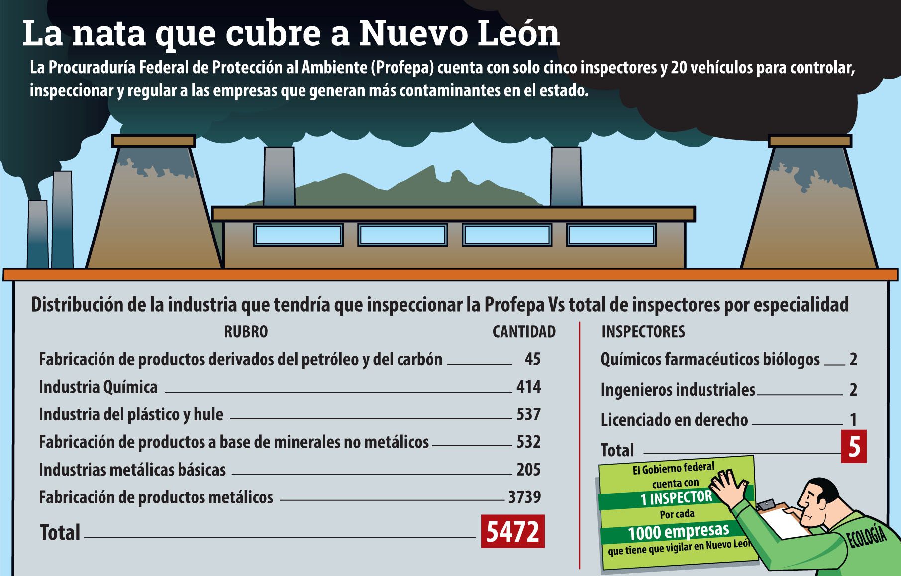 Pese al evidente problema de contaminación en el área metropolitana de Monterrey, la Profepa redujo en los últimos años el número de inspectores para el área industrial. Con base en datos obtenidos vía transparencia, se pudo constatar que en 2012 tenía ocho empleados de inspección industrial y actualmente solo tiene cinco: dos químicos farmacéuticos biólogos, dos ingenieros industriales y un licenciado en derecho.