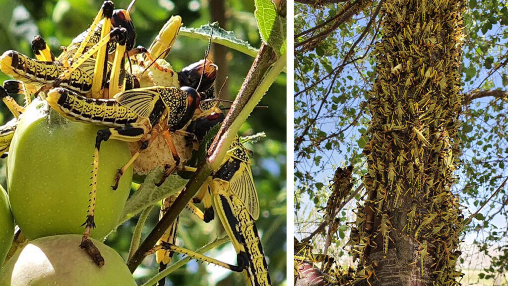 Las nubes de langostas (que pueden avanzar 125 a 190 millas durante el día mientras descansan por la noche) pueden alcanzar tamaños de hasta 1.5 millas cuadradas.