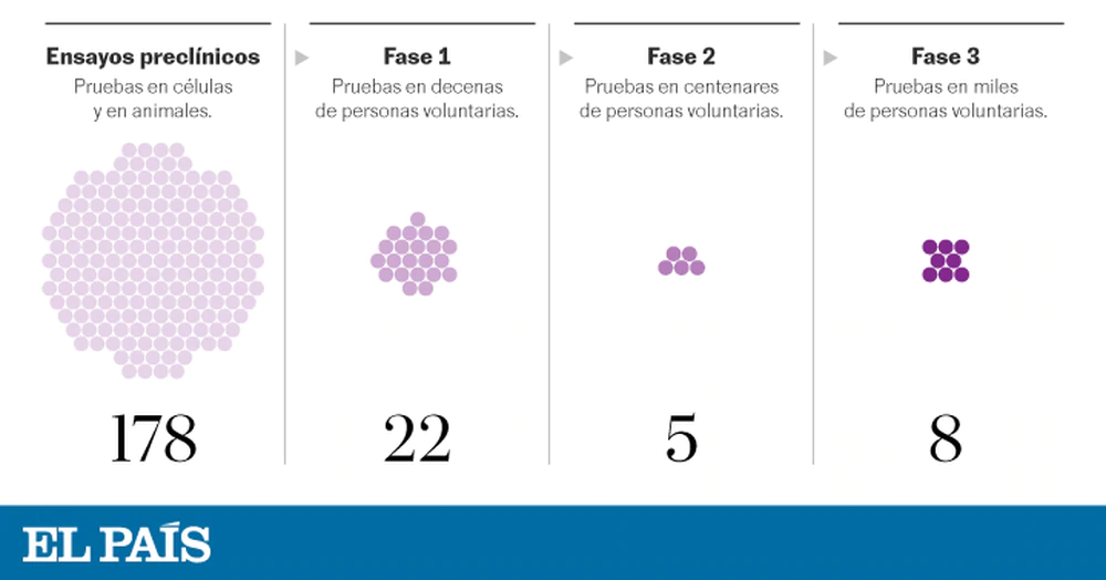 Y es que para que una vacuna sea apta para su aprobación debe pasar por cuatro fases previas. Los ensayos preclínicos tienen lugar en células y animales, como ratones o monos, y las fases 1, 2 y 3 en humanos. En la fase 1 se suministra la vacuna a un pequeño grupo de personas para descartar efectos graves y evaluar efectos biológicos, incluida la respuesta inmune inducida. En la fase 2 se prueba con cientos de personas para evaluar la respuesta inmune inducida, ajustar la dosis y confirmar la seguridad. En la fase 3 se demuestra que la vacuna es segura y eficaz en un ensayo con decenas de miles de personas.