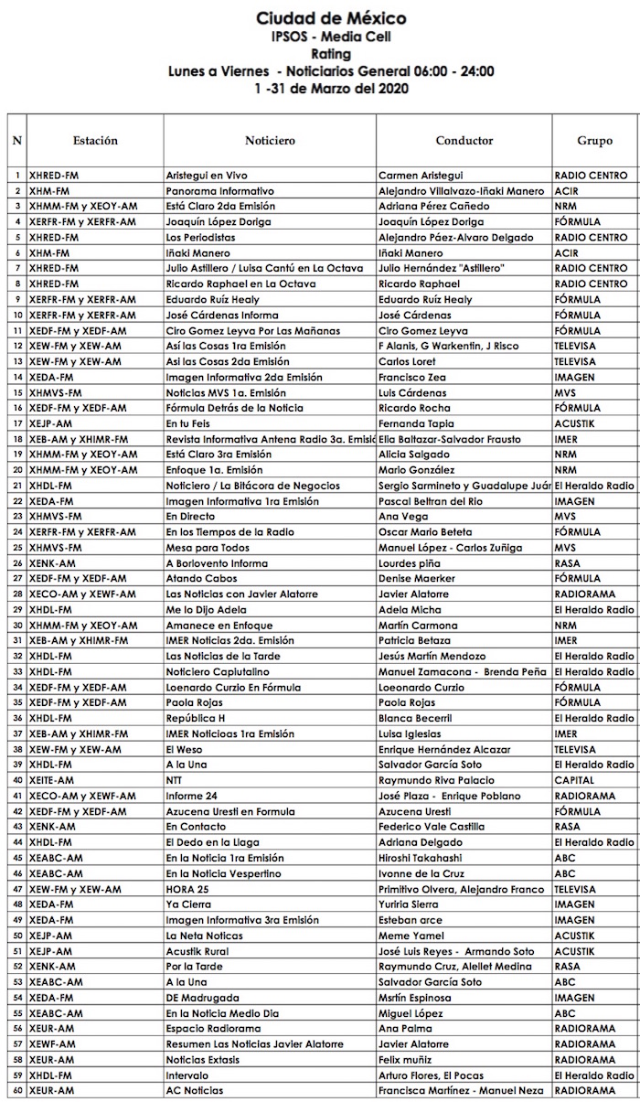 “Hay cambios importantes en la lista. Por ejemplo, el cuarto lugar en la medición de IPSOS era de Iñaki Manero, en ACIR y por Siempre 88.9; ahora está en sexto. Y en el quinto sitio aparecía Ciro Gómez Leyva, que se transmite por el 104.1 de Radio Fórmula; ahora está en el lugar 11, de acuerdo con la misma empresa. La medición de IPSOS es del 1 al 31 de marzo pasados”.