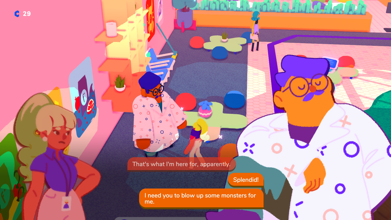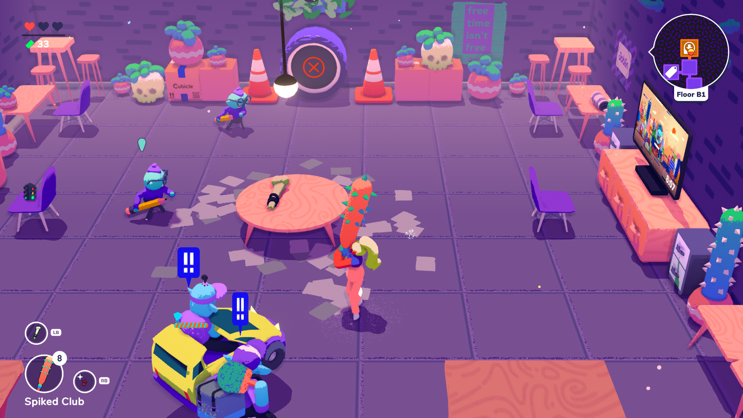 Junto con una alegre variedad de entornos coloridos y personajes extravagantes, Hundirse También es bastante divertido. Los NPC suelen ser trabajadores de oficina estereotipados, pero con sus personalidades llevadas al extremo. Incluso las empresas emergentes fallidas pueden provocar una sonrisa sólo con sus nombres o descripciones. Tomemos como ejemplo a Joblin, una empresa de economía informal que termina siendo perseguida por duendes. La presentación se completa con un estilo artístico estrafalario y una banda sonora agradable que se sincroniza bien con el juego maníaco.